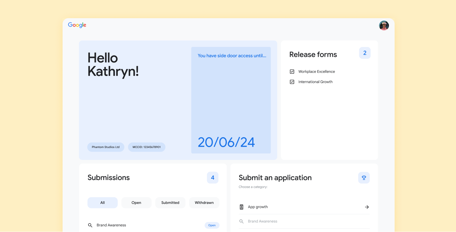 The Google Agency Awards celebrate the best in marketing, but as the program expanded, its platform struggled to keep up. We stepped in to overhaul the experience, streamlining the process for both applicants and Googlers managing entries.
