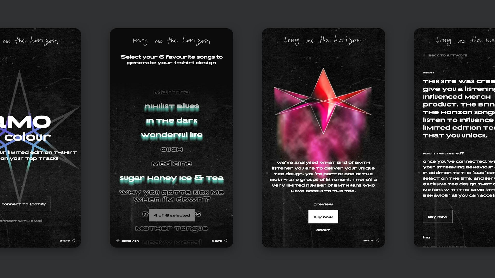 For Bring Me The Horizon’s highly anticipated album Amo we created Amo in Colour - a first-of-its-kind merch experience that utilised Spotify listening data to generate completely unique, fan-personalised tees, making music as wearable as it is listenable.